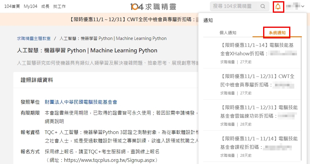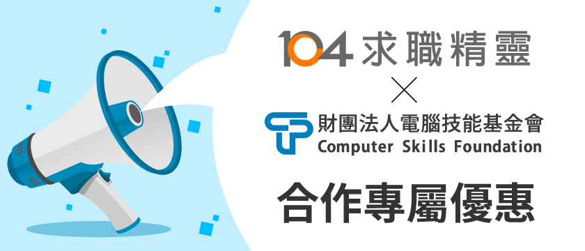 CSF與104求職精靈提供您技能學習與認證管道,登入104會員後,專屬優惠詳見系統通知頁面右上角小鈴鐺,104求職精靈https://nabi.104.com.tw/cjcat/
